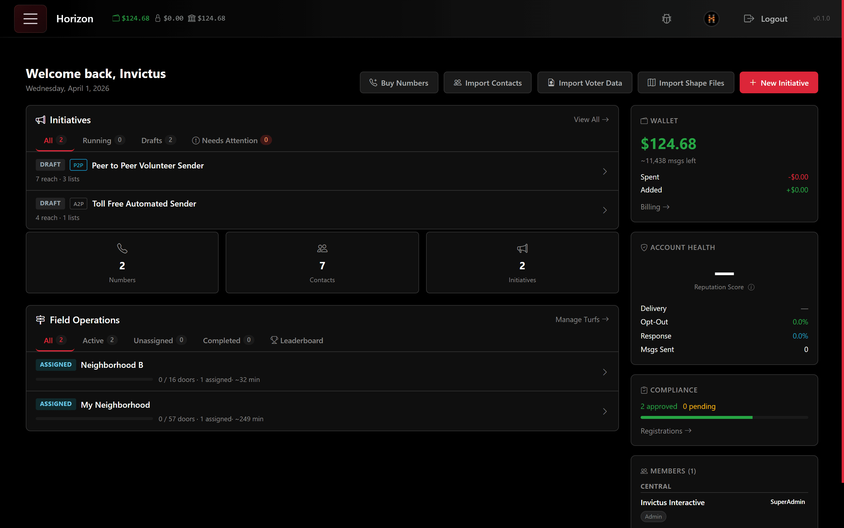 Horizon is an all-in-one outreach platform built for political campaigns, PACs, and advocacy organizations. It combines high-volume A2P texting, peer-to-peer messaging, door-to-door canvassing, phone banking, donation processing, and real-time analytics - with TCPA compliance built in from day one.
