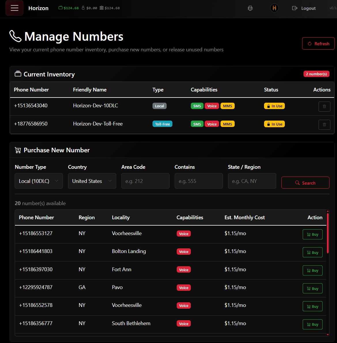 find available numbers, buy them, use them